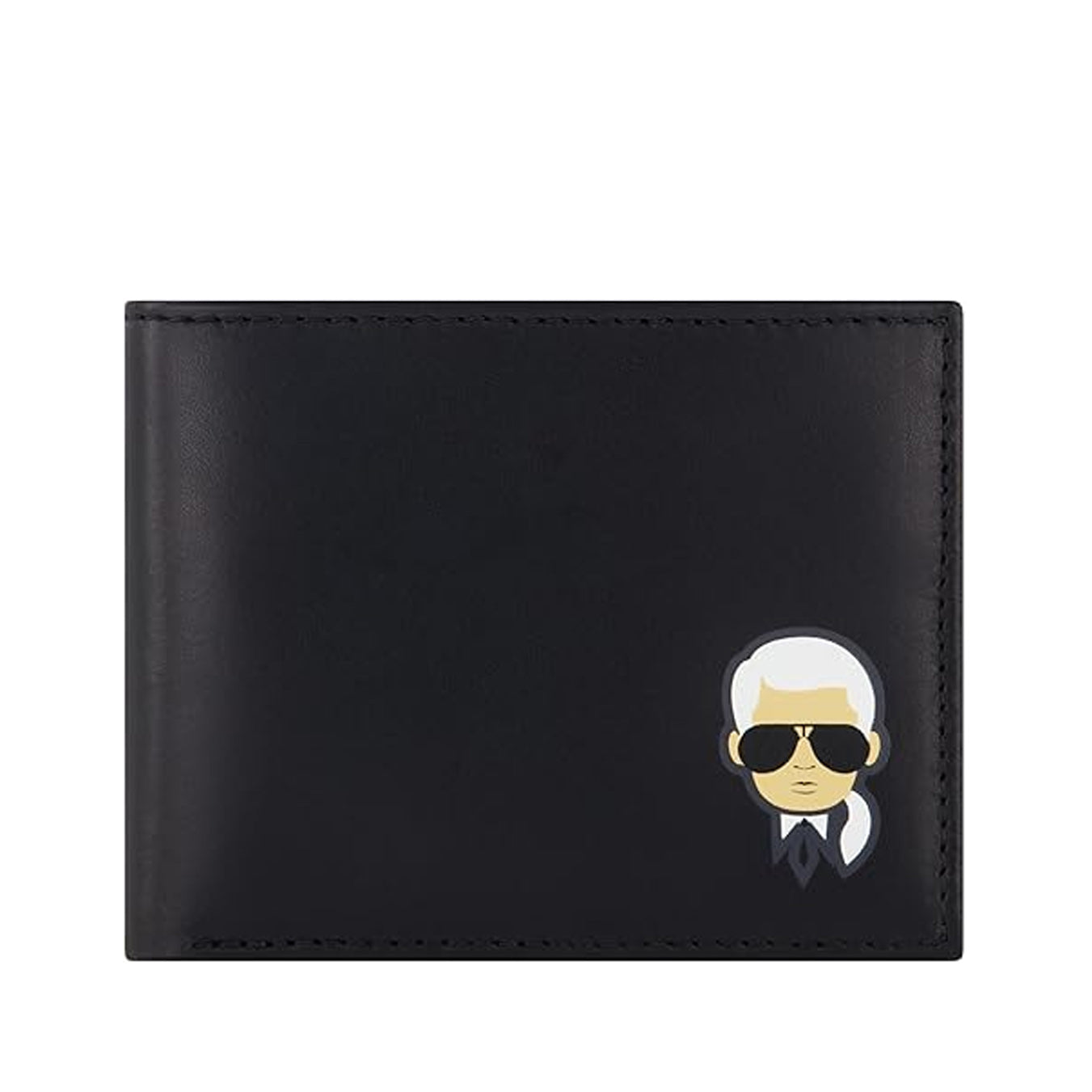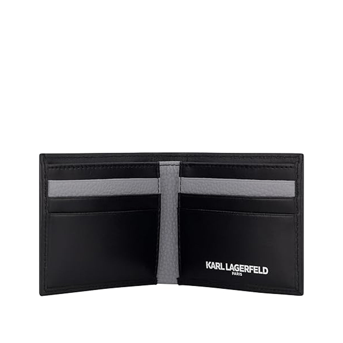 The exterior corner features the unmistakable Ikonik Karl silhouette—a playful and sophisticated nod to the legendary designer. Open the wallet to find a refined, practical interior with a striking two-tone black and grey finish. The contrast adds a subtle pop of character while providing ample organization for your cash and cards.